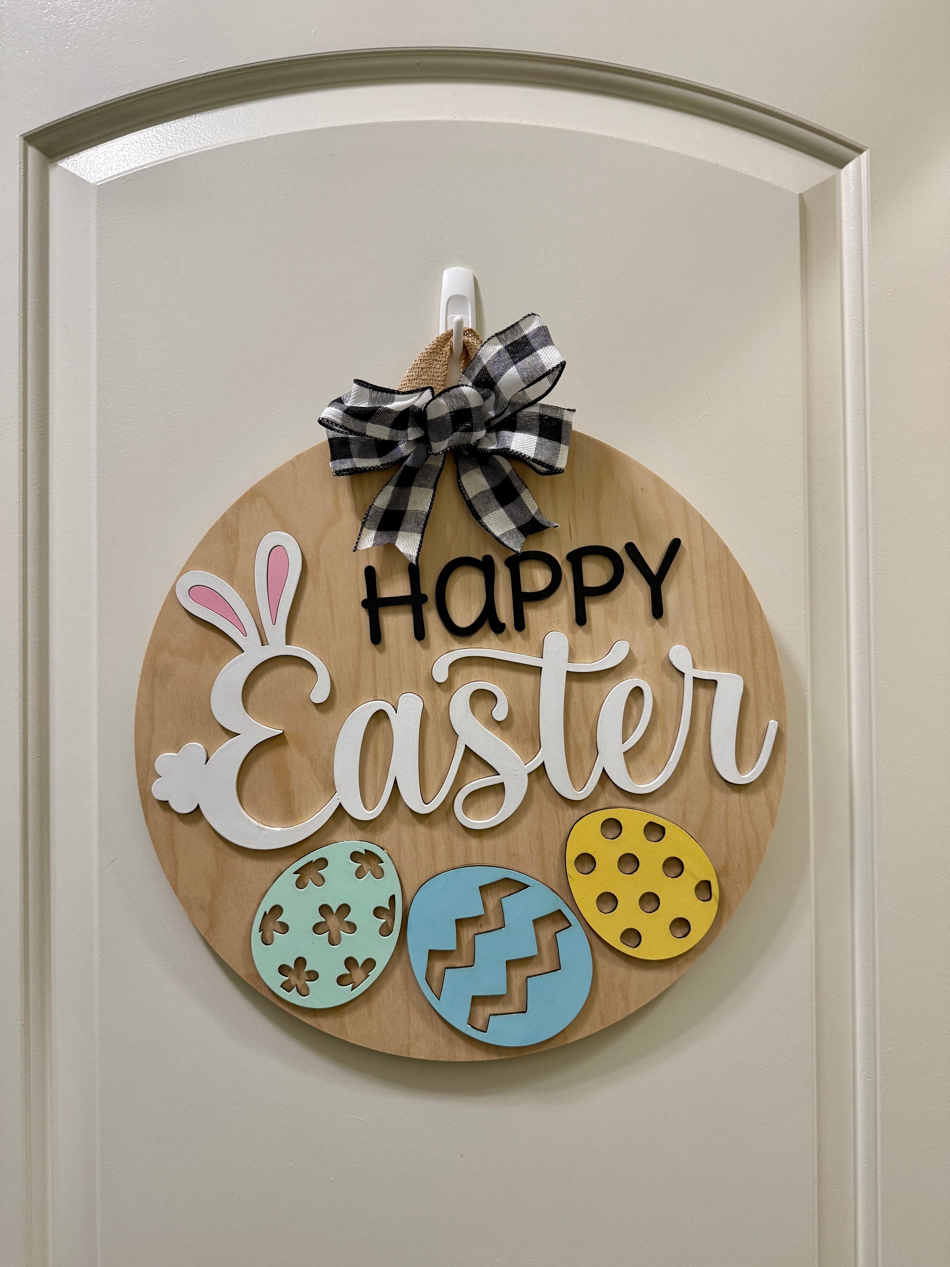 Welcome spring with our Happy Easter Eggs door hanger — a sweet and cheerful way to dress up your front door. This 15.5” round sign is made from sturdy 1/2” birch plywood and features laser cut graphics with layered bunny ears and three colorful patterned eggs for the perfect pop of pastel charm. Each detail is hand-painted on a natural wood background and finished with a classic black-and-white bow that ties it all together beautifully.