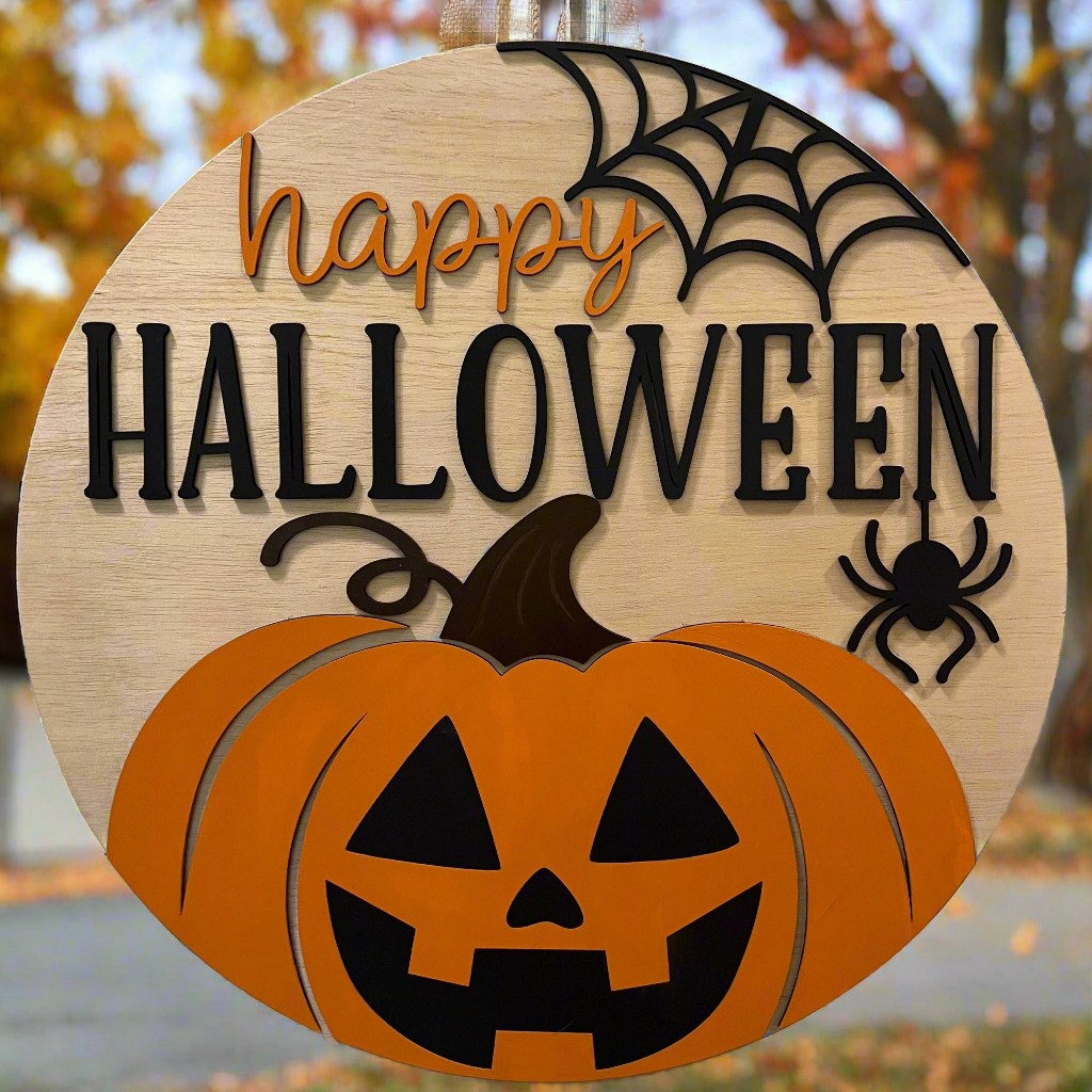 Add a touch of festivity to your front door this Halloween with this delightful round door hanger. A friendly pumpkin with a playful jack-o'-lantern face greets you, surrounded by a fun spider web and a cute little spider. Written in a whimsical font, the words "Happy Halloween" complete this charming and attention-grabbing design.