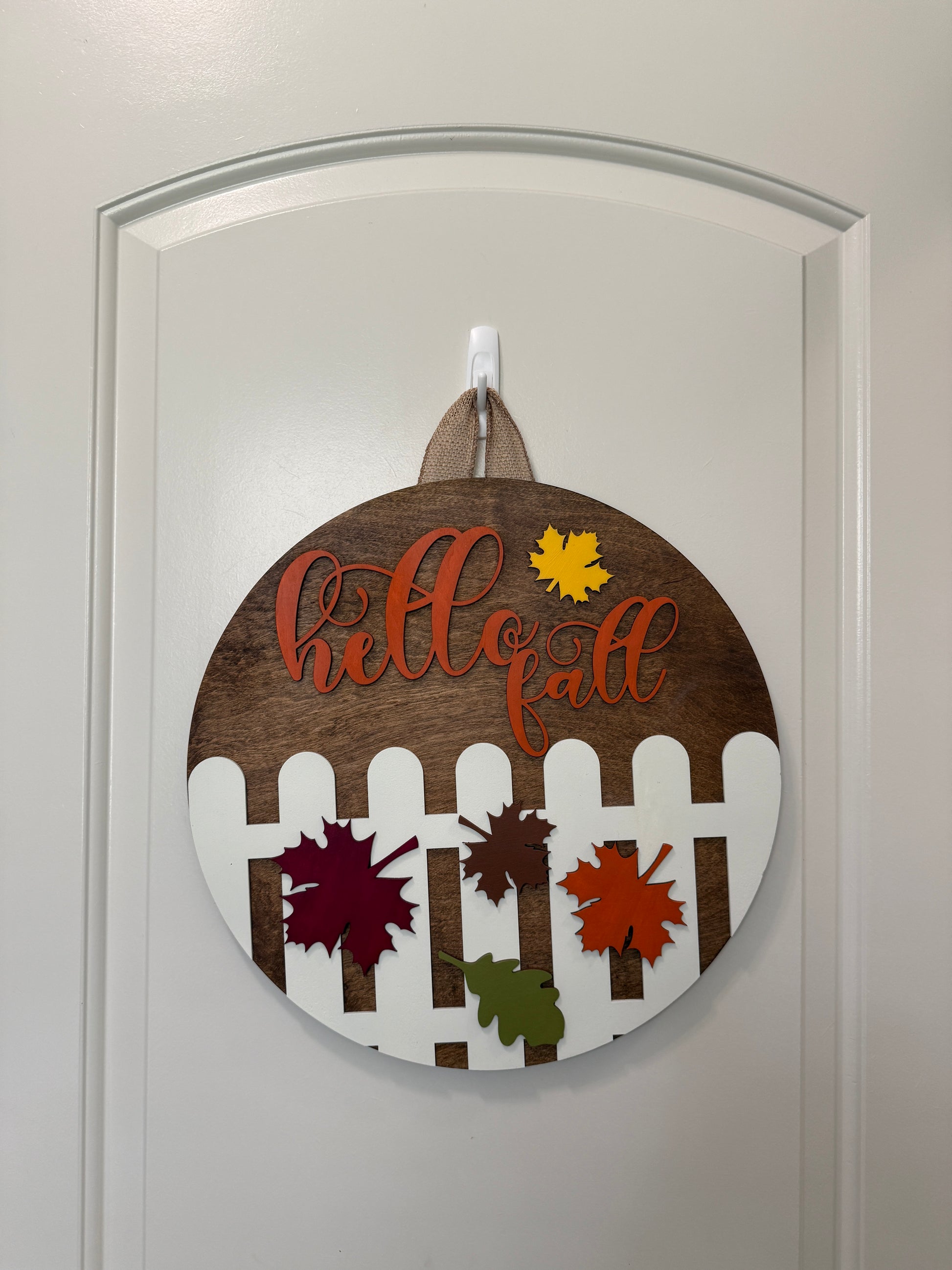 This delightful circular door decoration is a great option for greeting the autumn season! It showcases a rustic wooden backdrop with a lively "Hello Fall (White Picket Fence)" statement in a playful cursive font. Below, a white picket fence embellished with vibrant fall leaves brings a hint of whimsy and charm. This sign is guaranteed to bring some festive joy to your door or wall.