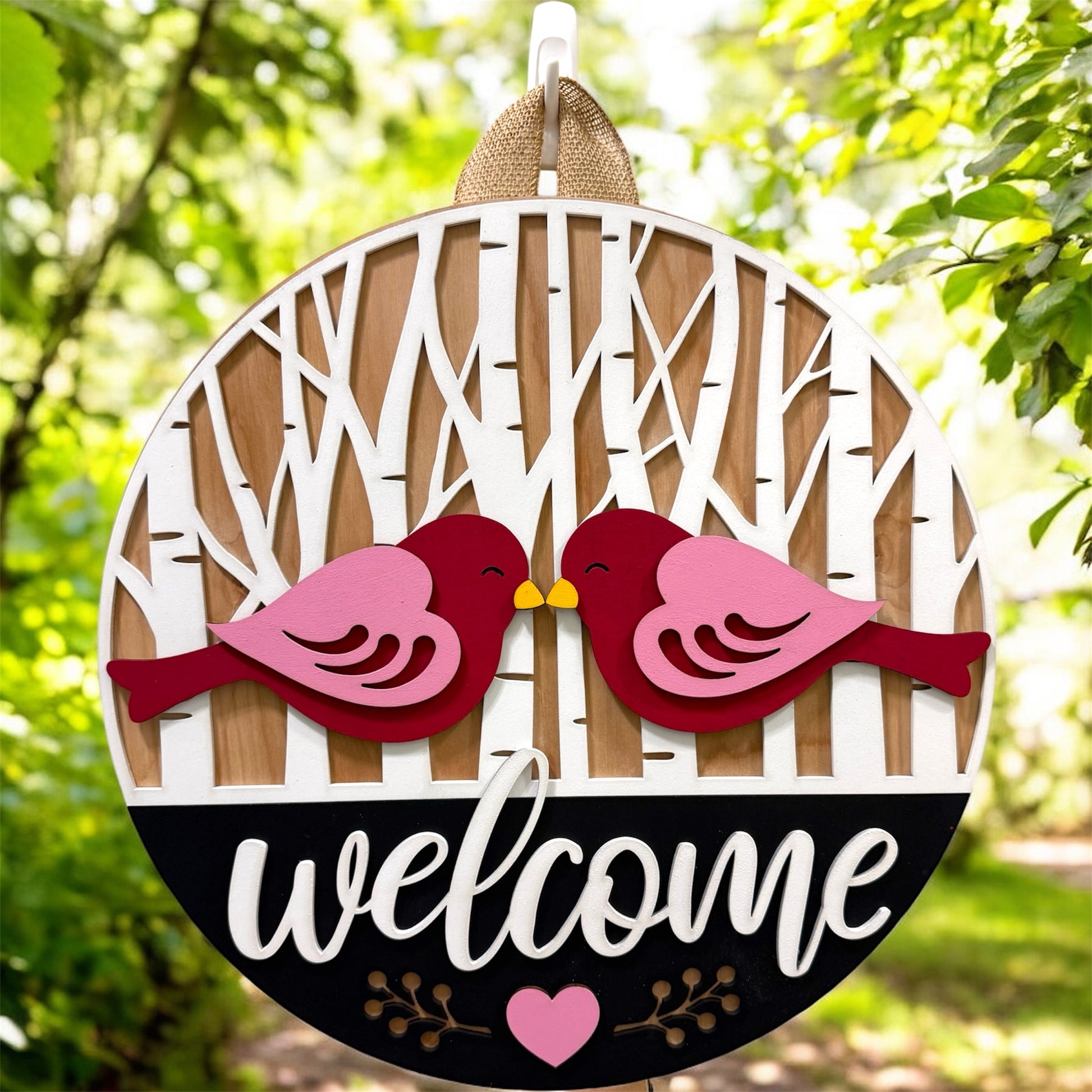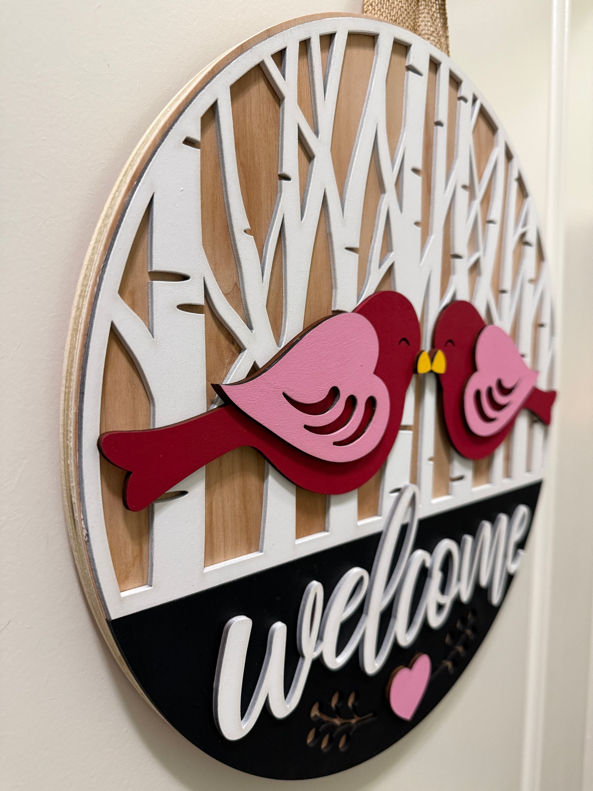 Welcome your guests with a little romance and a lot of charm. The Love Birds door hanger features two sweet birds sharing a nose-to-nose moment, perched in front of a birch-inspired backdrop that says “welcome” before you even open the door. The layered laser-cut design adds depth and personality, while the hand-painted details give it that cozy, handcrafted feel. It’s the perfect sign for couples, newlyweds, or anyone who believes love should be announced right at the front door. Fair warning: guests may smile before they knock.