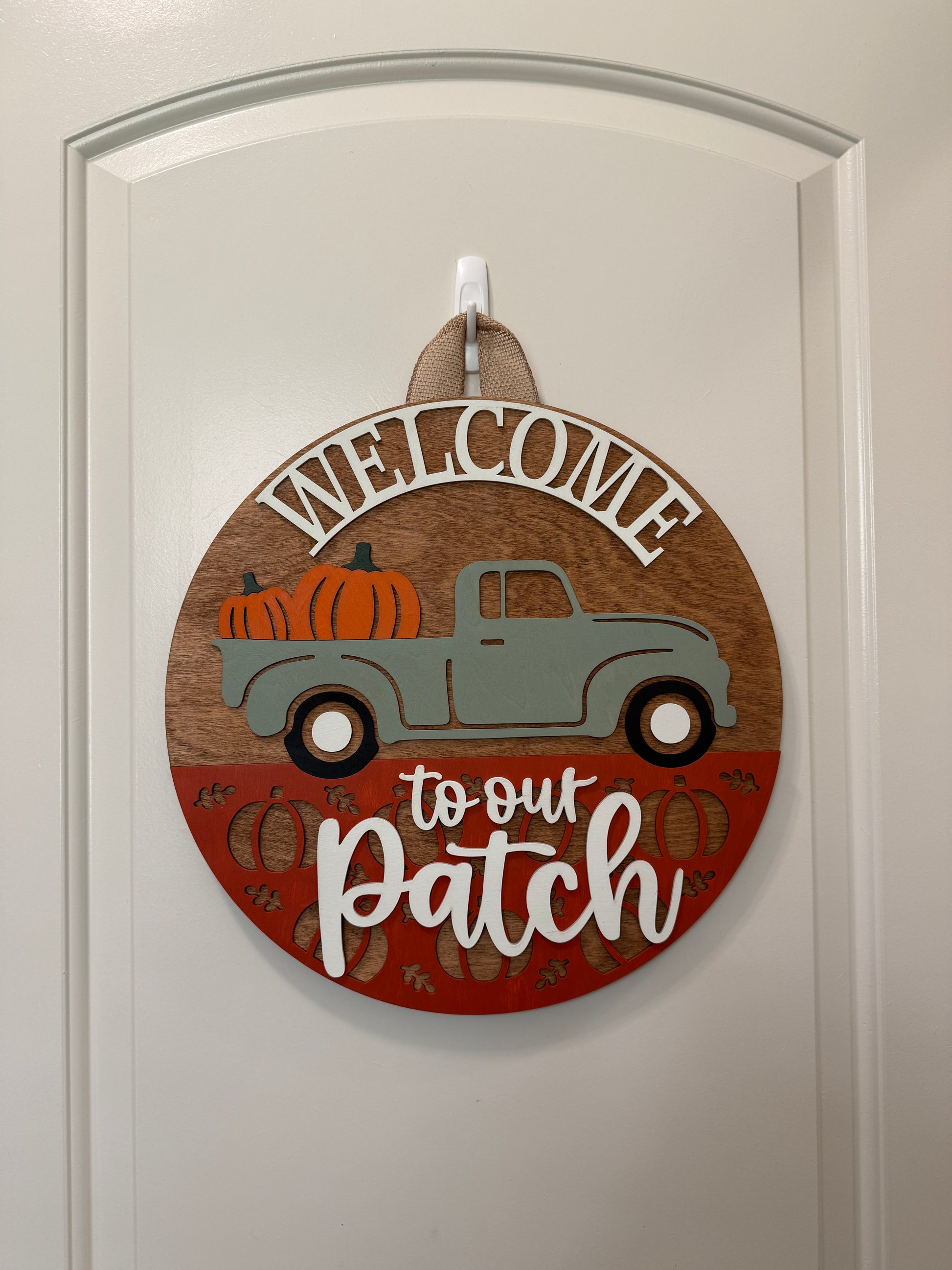 This charming round door sign is perfect for welcoming friends and family to your home during the fall season. Featuring a vintage truck overflowing with pumpkins, the sign showcases the warm and inviting message "Welcome to Our Patch" in a playful font. Need a different color truck? We can do that!