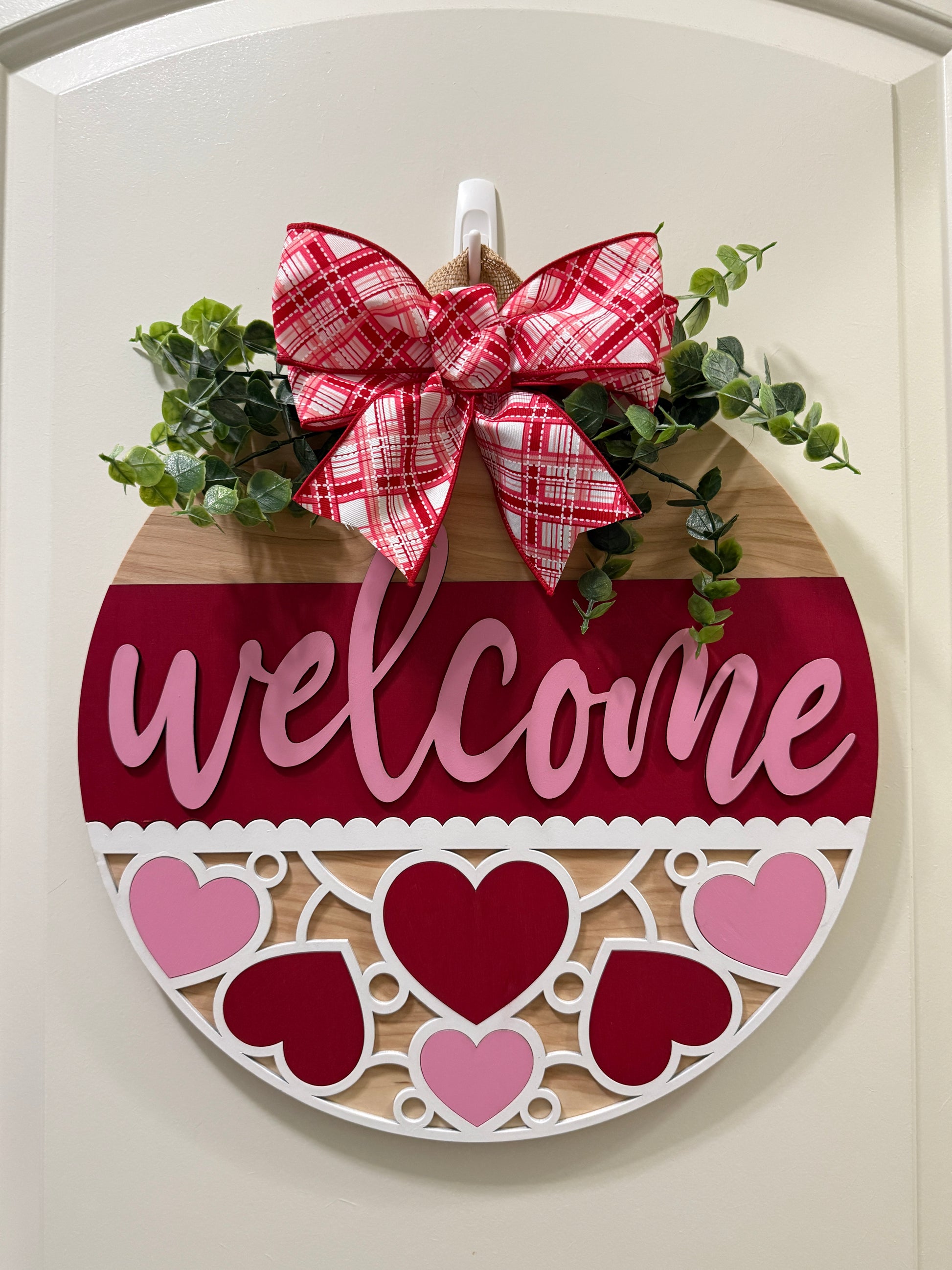 Welcome Valentine is the kind of door hanger that makes your front door feel like it dressed up for date night. With bold layered hearts, soft pink lettering, and rich Valentine reds, this design strikes the perfect balance between romantic and welcoming—no awkward love poems required. The laser-cut details add depth and charm, while the greenery and classic bow up top give it that “I have excellent taste” finishing touch. At 15.5 inches round and crafted from sturdy 1/2” birch plywood, this hand-painted sign brings just the right amount of love to your entryway without going full candy aisle explosion. It’s sweet, stylish, and way more reliable than chocolates left in a hot car.