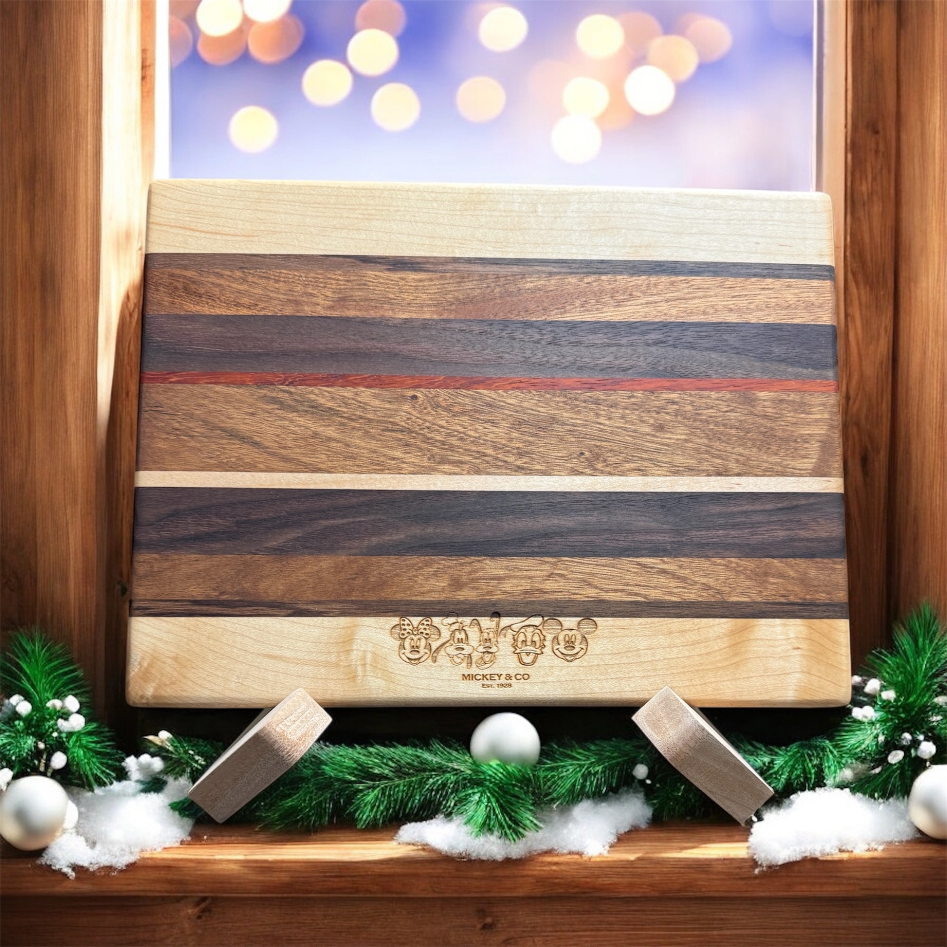 Bring a little magic to your kitchen with this handcrafted cutting board featuring the beloved Mickey & Co. gang, engraved front and center. Made from a beautiful blend of walnut, cherry, sapele, paduk and maple, this 12” x 9” board combines durability with a nostalgic touch of Disney charm.