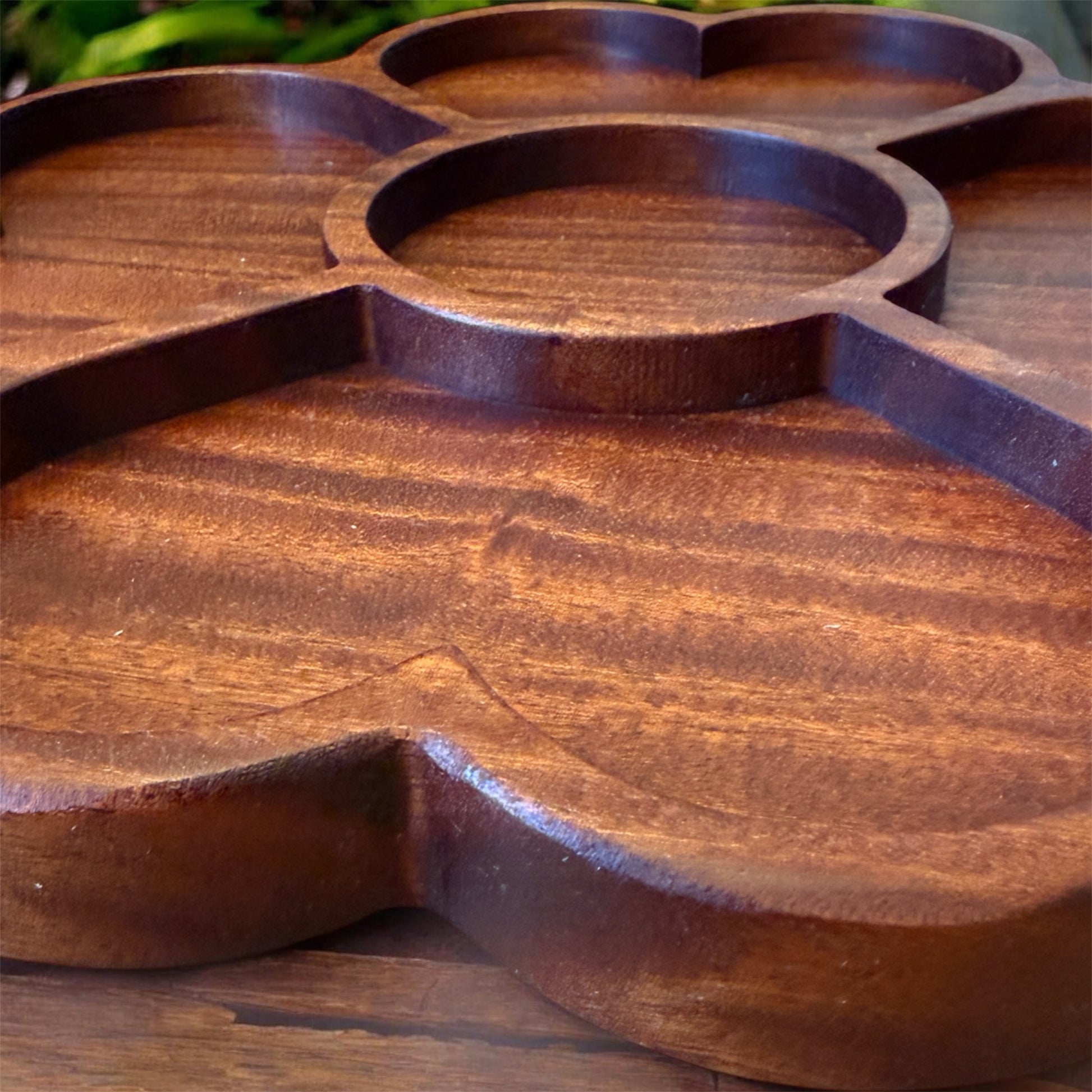 The Carolina Blossom Tray measures approximately 14” x 14” and features a beautifully sculpted floral design with four outer compartments and a center round section — perfect for charcuterie, fruit, nuts, candies, dips, or small bites.